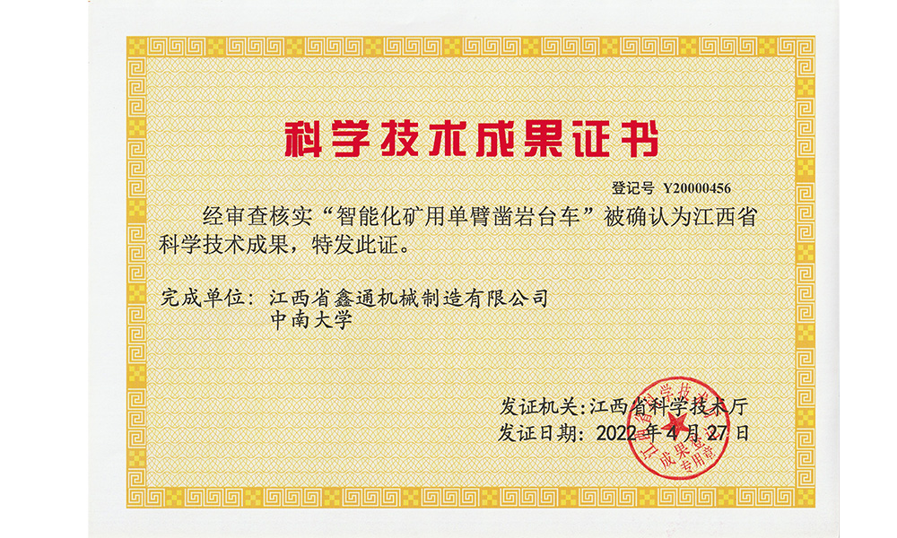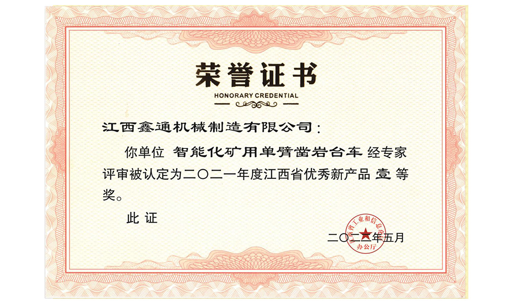 智能化礦用單臂鑿巖臺車榮譽(yù)證書